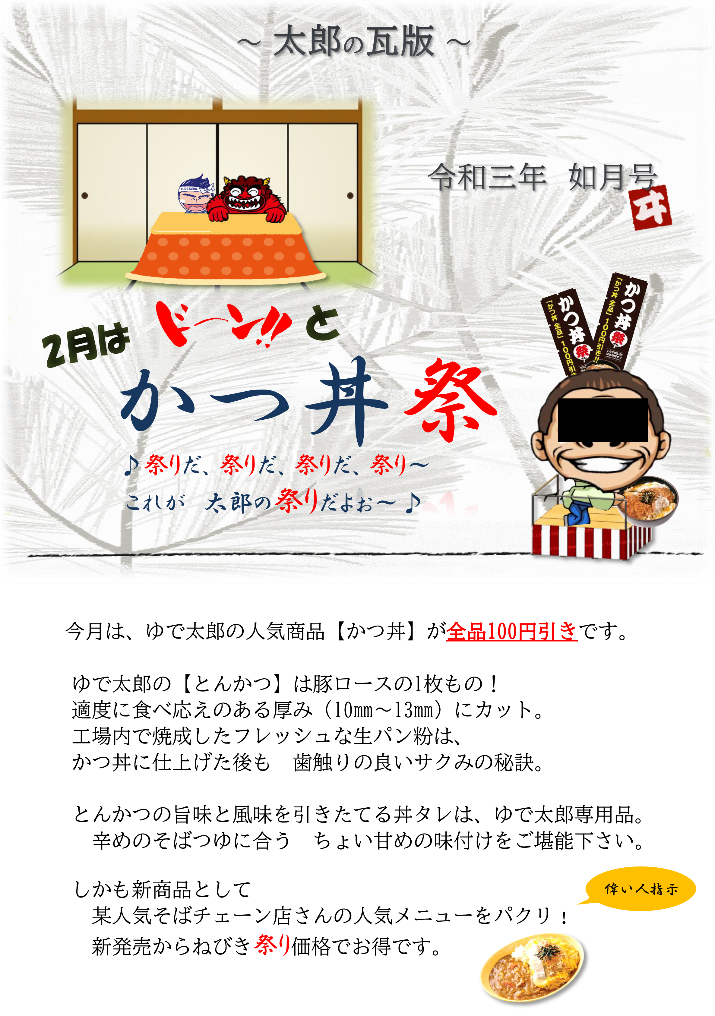 更に更に、2月は「かつ丼」祭りと銘打って、かつ丼全品¥100引きと言うのは嬉しいですね。しかもそのキャンペーン告知「太郎の瓦版」もぶっ飛んでおります。緊急事態宣言を受け、もう何でもやってやろう!って感じなんですかね?ゆで太郎システムグループさんw