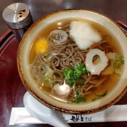 久々に肉そばとちくわ磯辺揚げも、相方は砂丘そば