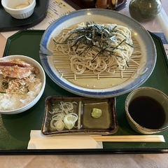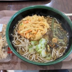 店内におそばコーナーがあったのでかき揚げそばとごま塩おむすびをいただいた。