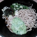 冷たいそばに、オクラ・とろろ・梅・ブロッコリー・昆布・湯葉・ネギがのっています。